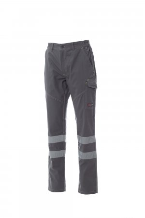 Uniszex nyári nadrág, elasztikus fényvisszaverő oldalsó betéttel, a derékon övbújtatók, cipzá-ras, műanyag gombbal, két klasszikus szabású első zseb, a bal oldali LOCK SYSTEM típusú, mé-rőszalagzseb. Két hátsó zseb, az egyik nyitott, a másik tépőzáras hajtókával, elütő színű betét, a hátsó zseben fényvisszaverő csíkkal. Színben illő szegés és varrás, fluoreszkáló sárga kontrasztos csíkokkal, a Total Black színben.