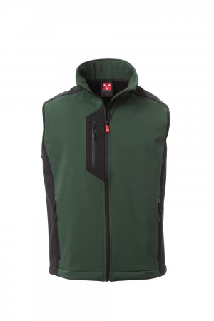 WP 8000 mm H₂O, WVT 5000 g/m² 24h. Gilet soft-shell 3 strati, da uomo, bicolore, chiusura tramite zip con cursore in metallo "semi-auto lock" e tiretto personalizzato. Due tasche laterali con zip, una tasca al petto con zip spalmata. Dettaglio retroriflettente sul carré dietro. Fondo regolabile con stopper personalizzati.