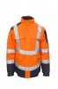 Giubbotto bicolore in alta visibilità con bande retroriflettenti, apertura con zip in plastica con cursore in metallo coperta da patta e velcro, cappuccio con coulisse staccabile e/o richiudibile nel colletto, maniche a giro staccabili, vita elasticizzata, polsini regolabili. 4 tasche frontali con patta: petto destro con velcro, portapenne e porta badge a scomparsa; lato cuore con zip nascosta; 2 inferiori con apertura superiore con zip e bottone a pressione e apertura laterale. Interno imbottito non rimovibile, con colletto e spalle in micropile, zip sul fondo posteriore per agevolare stampe e ricami, con due bande che circondano il torace, le spalle e le maniche. Cuciture termonastrate.