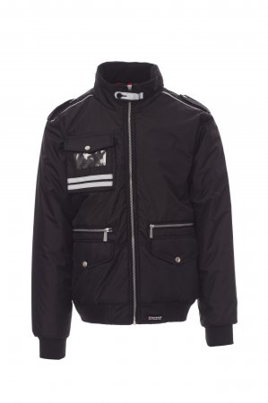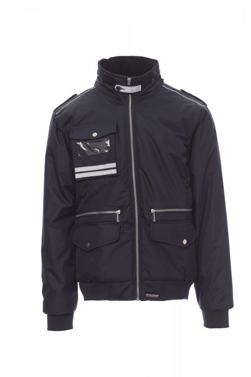 Giubbotto da uomo dal design casual dall’effetto slanciato, zip in plastica con cursore in metallo, cappuccio richiudibile nel colletto, rib in vita e ai polsi, spalline e chiusura al collo, due tasche LOCK SYSTEM, due tasche con cerniera, una tasca porta badge reversibile, piping reflex alle spalle e doppia fascia riflettente sulla tasca al petto e sulla schiena. Interno: imbottito, rifinito con fodera in alta densità argentata, schiena in micropile, colleto in pile, una tasca.
