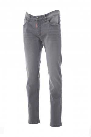 Машки панталони, џинс крој со пет џебови, закопчување со метален патент и копче, јамки на појас, 1 џеб за метро, 1 мал џеб за пенкала и сечач, третман stone wash, ефект на избледеност и износеност. Цевкести ногавици, шевови со дебел контрастен конец и три игли по цела должина на ногавица. Тежина на ткаенина: 10,50oz/yd².