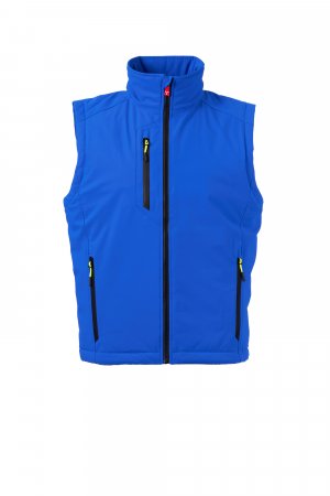 WP 8000 mm H₂O, WVT 5000 g/m² 24u. 3-laagse soft-shell bodywarmer voor heren, met medium wattering (140 g/m²), SBS-ritssluiting met metalen runner "semi-auto lock” en gepersonaliseerd treklipje. Reflecterende strip onderaan op de rug. Twee zijzakken met rits, een borstzak met gecoate rits. Fluorescerende runners. Een mesh binnenzak, met klittenbandsluiting. Onderkant verstelbaar met personaliseerbare stoppers.