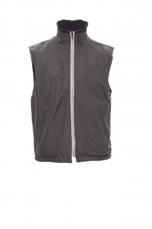 Vendbar vest til herre, plastglidelås med refleksprofil, snøring i midjen, tre ytterlommer. Fleecefôr, ribbestrikk på innsiden av kragen, to brystlommer og glidelås på brystet for lettere trykk og brodering.