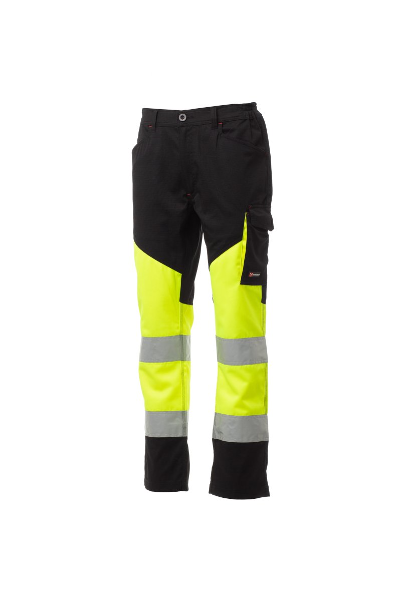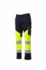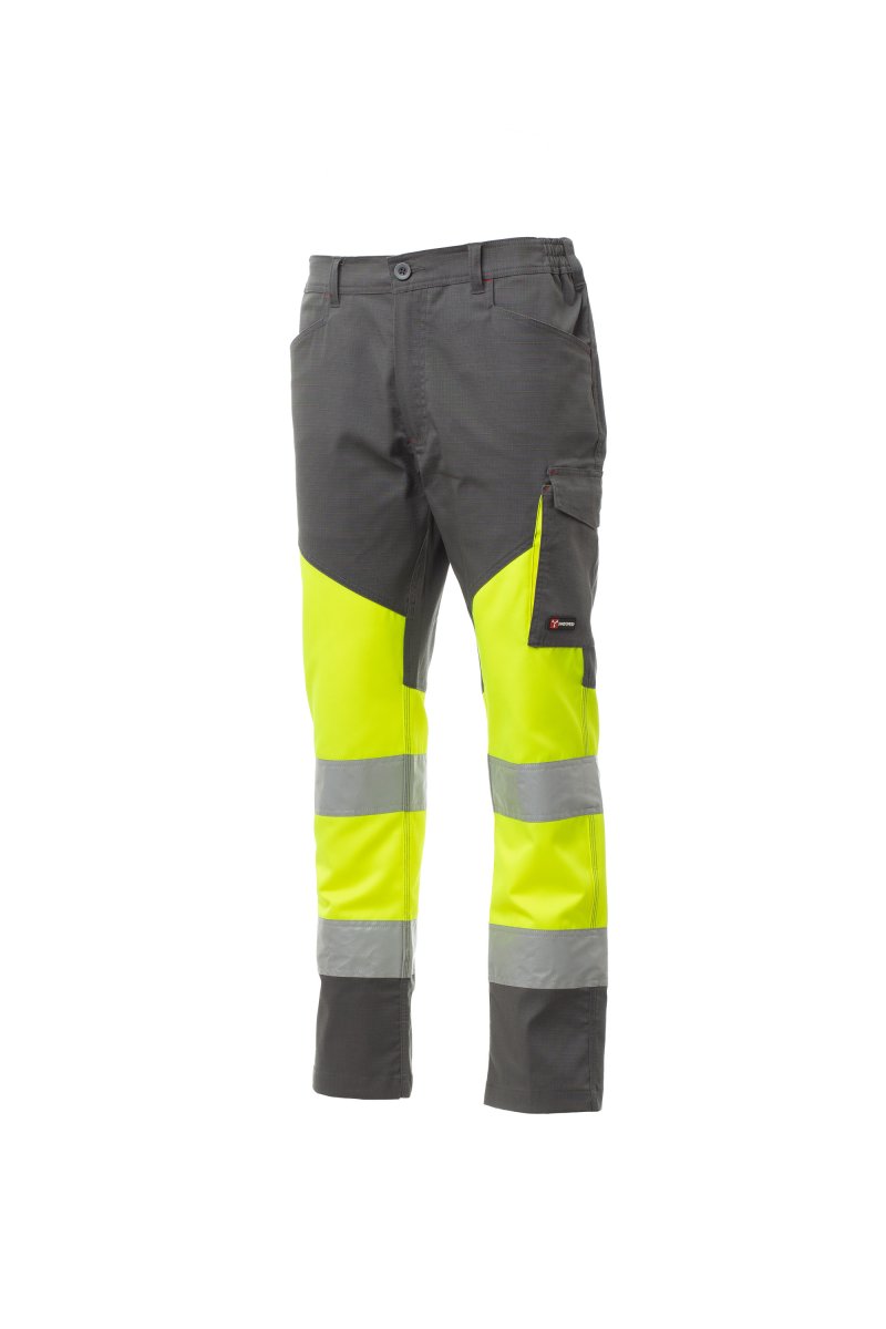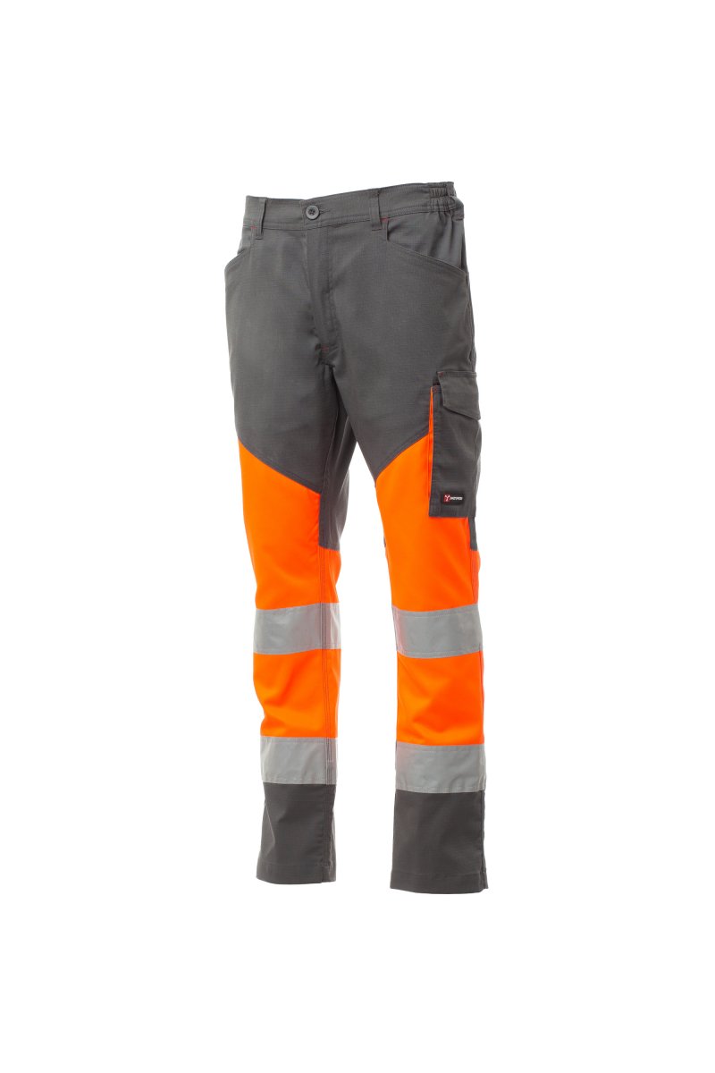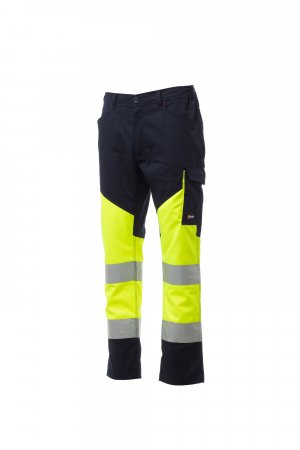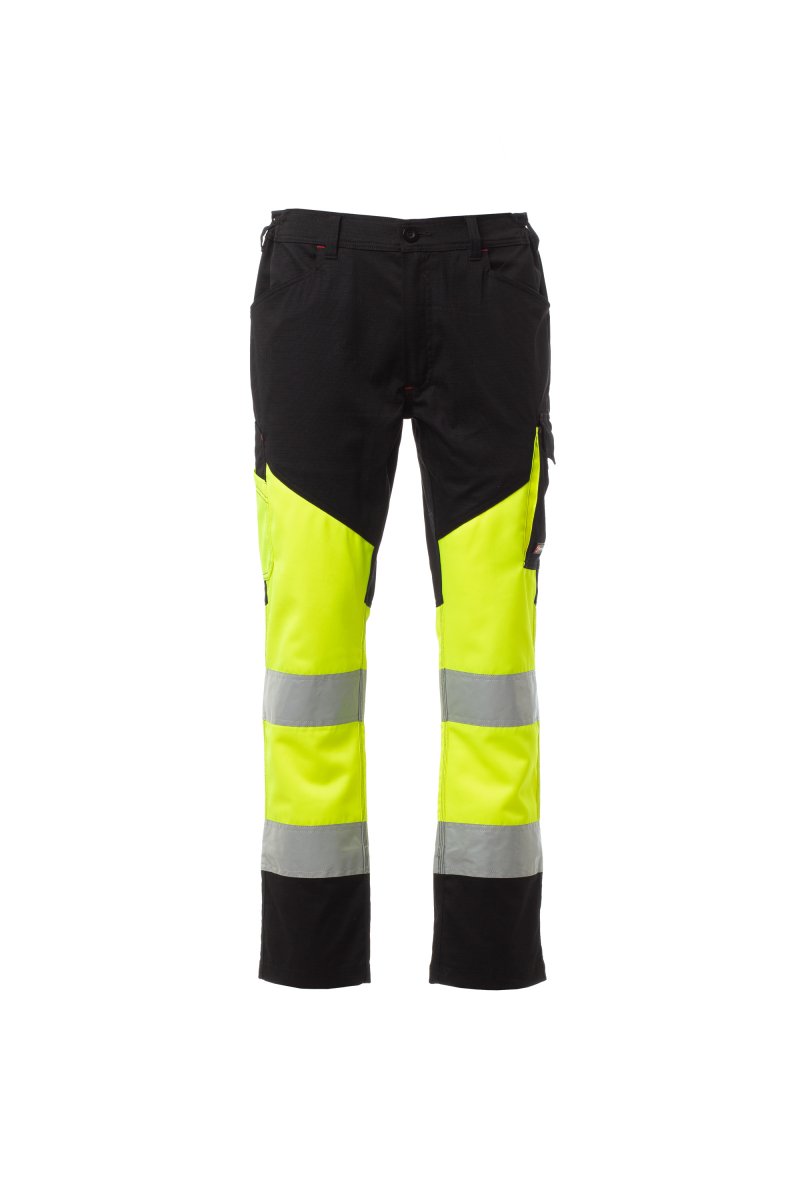 Spodnie unisex, letnie, dwukolorowe, o wysokiej widoczności, z paskami odblaskowymi, gumkami po bokach i szlufkami w talii. Zapięcie na zamek błyskawiczny i plastikowy guzik, dwie wyprofilowane przednie kieszenie, jedna boczna kieszeń z zapięciem LOCK SYSTEM i zdejmowanym uchwytem na identyfikator oraz druga z podwójnym uchwytem na taśmę mierniczą. Dwie tylne kieszenie: jedna otwarta z paskami odblaskowymi i jedna z klapką i rzepem. Przeszycia pod kolor kontrastujące z tkaniną. Potrójne szwy w kroczu i na wewnętrznej stronie nogawki. Międzynarodowy rozmiar L ma wewnętrzną nogawkę o długości 80 cm.