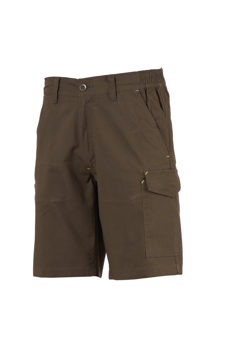 Bermudy z tkaniny ripstop stretch, lekkie, ze szlufkami i z gumką w talii, zapinane na klapę i zamek błyskawiczny i guzik na pasku. Z przodu kieszenie o kroju klasycznym, kieszonka na monety, z prawej strony kieszeń na taśmę mierniczą, z lewej strony boczna kieszeń z patką zamykającą LOCK SYSTEM. Z tyłu dwie kieszenie, z czego jedna z patką i rzepem. Trzyrzędowe przeszycia.