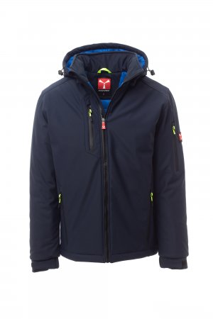 WP 8000 mm H₂O, WVT 5000 g/m² 24h. Soft-shell în 3 straturi, cu căptușeală caldă (160g/m²), pentru bărbați, guler cu inserții din fleece, închidere cu fermoar SBS cu cursor metalic „semi-auto lock” și dispozitiv de tragere personalizat. Glugă detașabilă cu șnur reglabil. Guler interior cu detalii laterale din fleece. Benzi reflectorizante pe partea din spate la nivelul taliei și pe partea din spate a glugii. Manșete elastice, reglabile, închise cu scai. Două buzunare laterale cu fermoar, un buzunar cu fermoar la piept și un buzunar cu fermoar pe brațul stâng cu suport pentru pix integrat. Dungi fluorescente. Un buzunar interior închis cu scai. Partea inferioară reglabilă cu opritor personalizat.