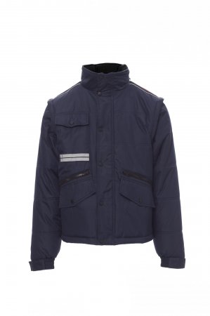 Moški jopič s snemljivimi rokavi, 8 mm plastično zadrgo s kovinskim drsnikom s plastičnim gumbom in zavihki, oblikovan zadnji del z zložljivo kapuco v ovratniku, dva zunanja žepa z zapiranjem LOCK SYSTEM, dva žepa z zadrgo, poševni žepi za lažji dostop, en prsni žep za pametni telefon in obroček za izkaznico, odsevna trakova na žepu in hrbtni strani. Notranjost: podložena, kontrastna podloga iz flisa na hrbtu in ovratniku, en žep, zadrga za enostavnejši tisk in vezenje.