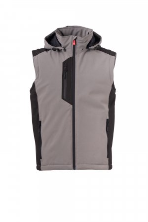 WP 8000 mm H₂O, WVT 5000 g/m² 24h. Moški dvobarvni soft-shell telovnik s 140 g/m² srednjo podlogo, iz dvoslojnega materiala, z zapenjanjem na zadrgo s kovinskim drsnikom s polavtomatskim zapiralnim mehanizmom in prilagojenim jezičkom. Snemljiva kapuca z nastavljivo vrvico. Dva stranska žepa z zadrgo in en prsni žep s prevlečeno zadrgo. Odsevni detajl na hrbtnem karéju. Dva notranja žepa – eden oblikovan z zadrgo, drugi za tablični računalnik, zaprt z ježkom. Spodnji rob je nastavljiv s prilagojenimi zategovalniki.