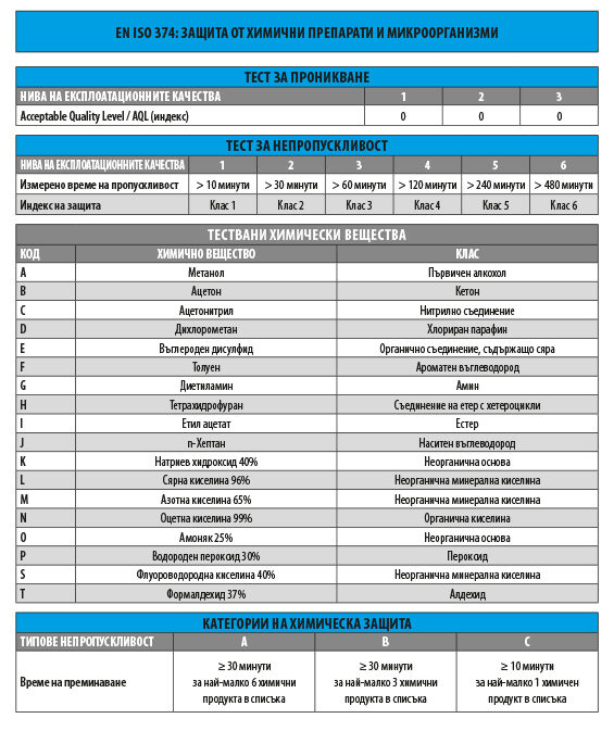 Стандартът определя изискванията за ръкавиците, предназначени да предпазват потребителя от химични препарати въз основа на три метода на изпитване: