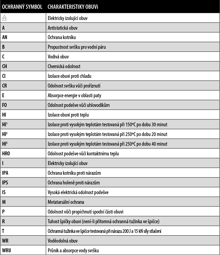 Symboly v následující tabulce označují doplňkové charakteristiky, potřebné pro některé speciální aplikace obuvi, které se přidávají k bezpečnostním kategoriím: