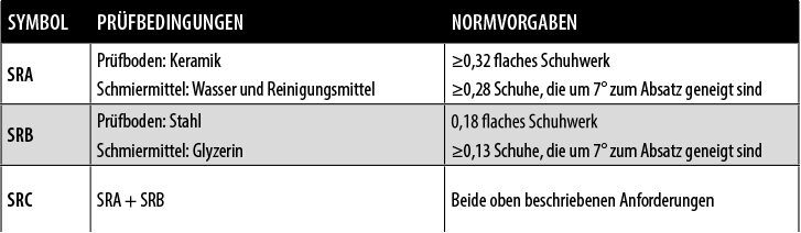 Diese Eigenschaft wird durch die EN ISO 20345:2011 nach der Methode der EN ISO 13287:2012 vorgeschrieben, gemäß Tabelle: