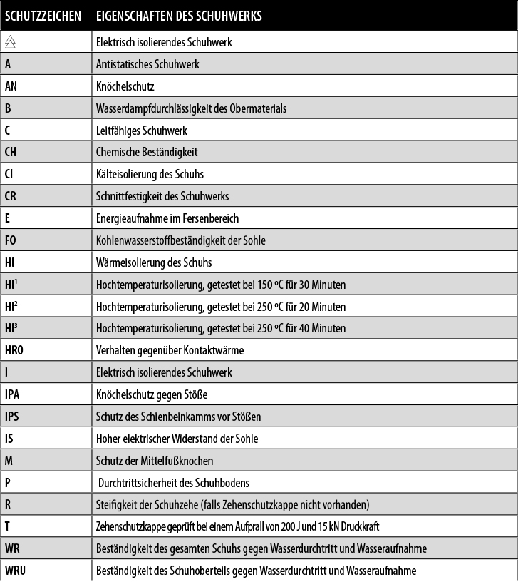 Die Symbole in der folgenden Tabelle kennzeichnen zusätzliche Merkmale, die für einige spezifische Anwendungen von Schuhen erforderlich sind und die den Sicherheitskategorien hinzugefügt werden: