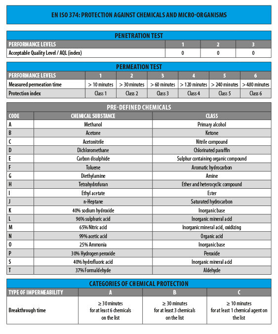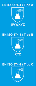 Chemical protection gloves are divided into three categories: Type A, B and C. The related pictograms and markings describe the type of chemical resistance and the level of performance obtained.