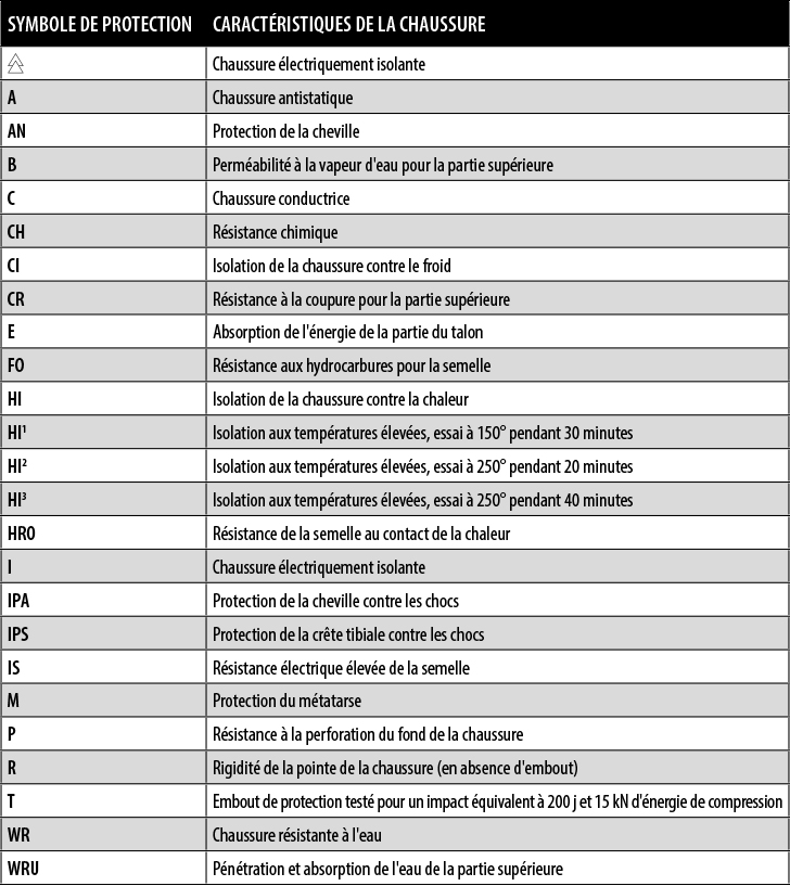 Les symboles du tableau cidessous identifient des caractéristiques supplémentaires, nécessaires pour certaines utilisations spécifiques des chaussures, qui viennent s’ajouter aux catégories de sécurité :