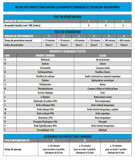 La norme spécifie les exigences de performance pour les gants destinés à protéger l’utilisateur contre les produits chimiques selon trois méthodes d’essai: