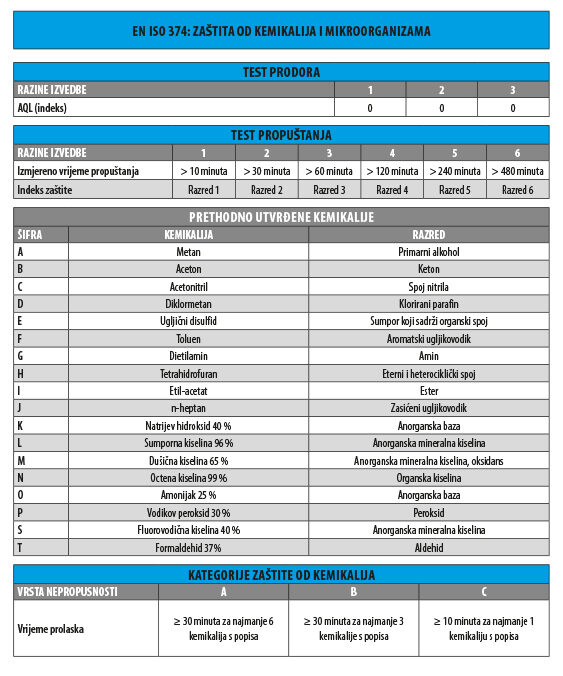 - Test propuštanja, odnosno prolaska kemikalije kroz materijal rukavice na molekularnoj razini u kojem se mjeri vrijeme potrebno da tekućina dođe u doticaj s kožom.