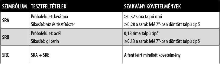 Ezt a tulajdonságot az EN ISO 20345:2011 szabvány írja elő az EN ISO 13287:2012 módszer szerint, mint a táblázatban: