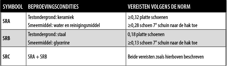 Deze eigenschap wordt opgelegd door de norm EN ISO 20345:2011 volgens de methode van de norm EN ISO 13287:2012 zoals weergegeven in de tabel: