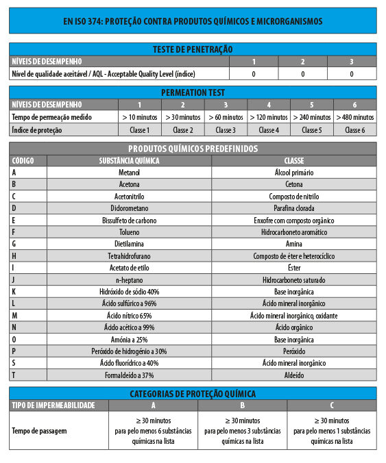 A norma especifica os requisitos das luvas destinadas a proteger o utilizador contra produtos químicos com base em três métodos de teste: