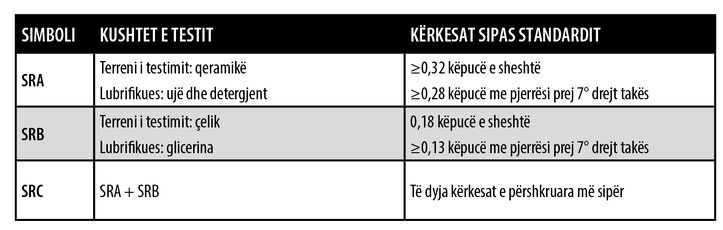 Kjo karakteristikë përshkruhet nga standardi EN ISO 20345:2011 sipas metodës së EN ISO 13287:2012 siç tregohet në tabelë:
