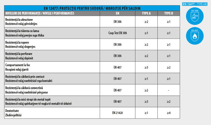 Përputhen me standardin EN 420 me përjashtim të gjatësive të dorezave që duhet të jenë si vijon: