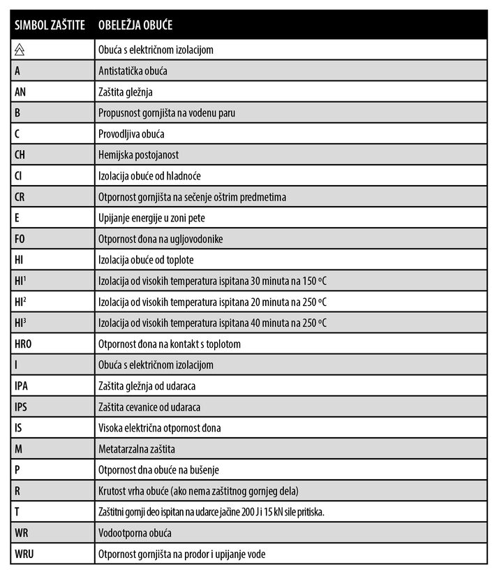 Simbolima u sledećoj tabeli označavaju se dodatna obeležja koja su neophodna za neka posebna područja primene obuće, a koja se moraju dodati sigurnosnim kategorijama: