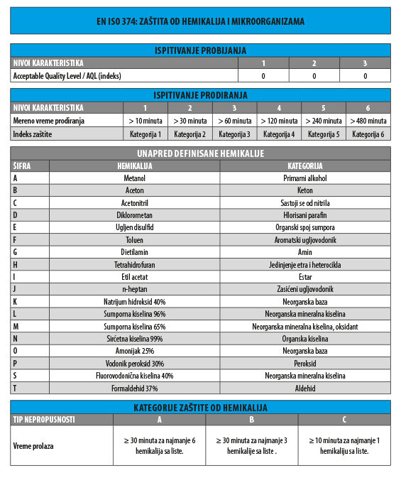 Standardom se utvrđuju zahtevi za rukavice dizajnirane da zaštite korisnika od hemikalija na osnovu tri metode ispitivanja: