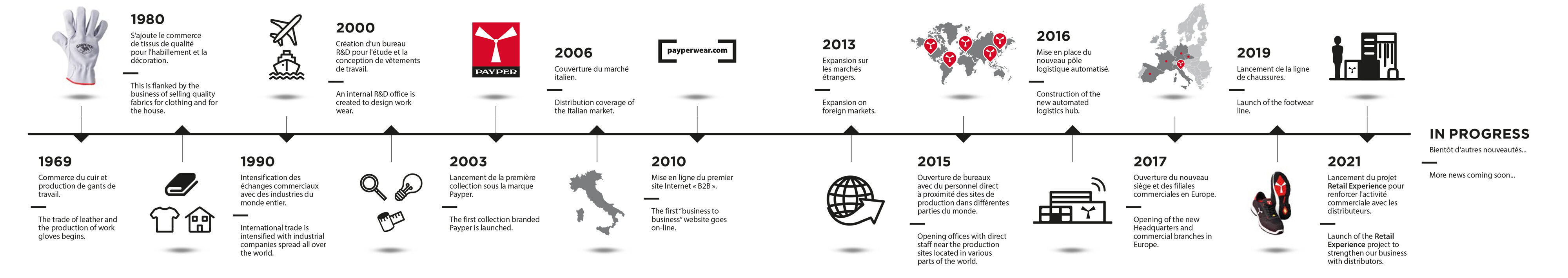 Payper est née sur une idée de la famille Valentini qui, en s’inspirant de la vie exemplaire de son ami pilote sauveteur, a décidé de se consacrer à la production de lignes de vêtements workwear et corporate wear conçus pour faciliter les mouvements des personnes, les protéger et les équiper de vêtements à l’esthétique particulièrement raffinée, typique du style italien. La croissance et la spécialisation de l’entreprise au fil du temps ont conduit, en 2003, à la naissance de Industrial Wear, dans le but d’industrialiser les expériences antérieures, d’enrichir le catalogue produits, de renforcer les services et de gagner de nouvelles parts de marché. En 2006, après la conquête de tout le territoire italien, l’entreprise a commencé à développer les exportations, réussissant en quelques années seulement à couvrir tous les principaux marchés européens. Aujourd’hui, elle dispose d’un catalogue de plus de deux mille articles, qualifiés par des brevets et de nombreuses certifi-cations, auxquels s’ajoutent chaque année plus de cinquante nouvelles créations du bureau R&D italien, toujours à la recherche de nouvelles solutions esthétiques et fonctionnelles. La production est gérée et soumise à de rigoureux contrôles qualité directement par son personnel des bureaux techniques situés dans diffé-rentes parties du monde. En 2017, elle a inauguré ses nouveaux locaux dans un headquarter moderne qui produit de l’énergie renouvelable et comprend une salle d’exposition de 800 m², où l’on peut voir toute la collection Payper, ainsi qu’un entrepôt équipé de systèmes logistiques intelligents de dernière génération.