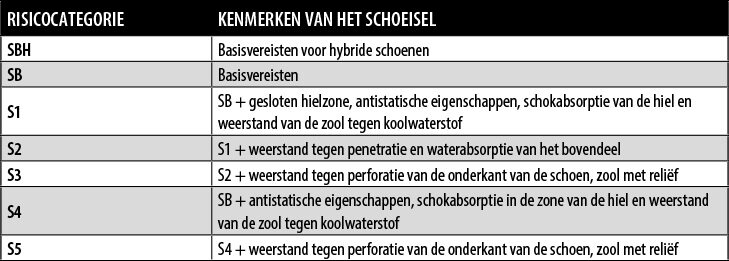 • De aanwezigheid van een teenbescherming die beschermt tegen stoten met kracht van 200 J (joule) en risico’s voor verplettering met een maximale kracht van 15 kN (kilonewton)