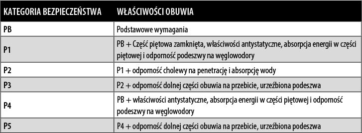 • Obecność podnosków chroniących palce stóp przed uderzeniami z energią równą 100 J (dżuli) oraz przed ryzykiem zmiażdżenia o maksymalnej sile 10 kN (kiloniutonów).