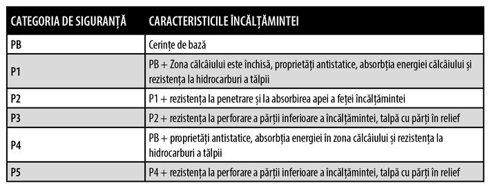 • prezența bombeului de protecție pentru degetele picioarelor care protejează împotriva loviturilor cu energie egală cu 100 J (Joule) și a riscurilor de strivire cu o forță de 10 kN (kiloNewton)