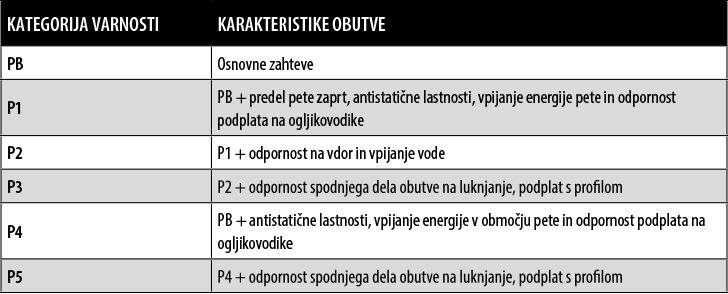 • Zaščitno kapico za varovanje prstov stopala, ki ščiti pred udarci z energijo 100 J (Joule) in pred nevarnostjo zmečkanin z največjo silo 10 kN (kilonewton).